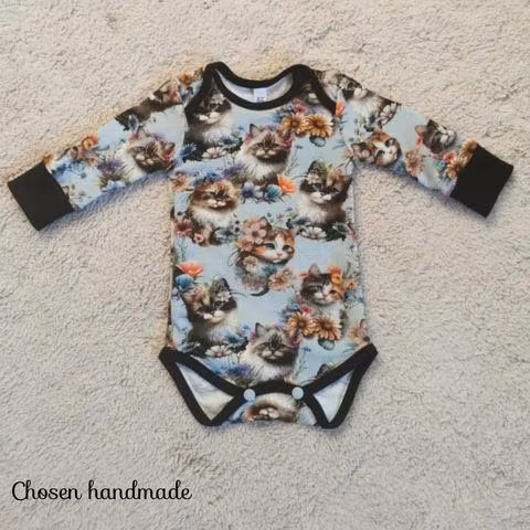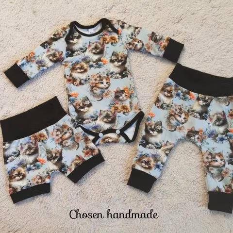 Söta babykläder sydda i följsam trikå som passar lika bra vid bus och lek som under en tupplur.