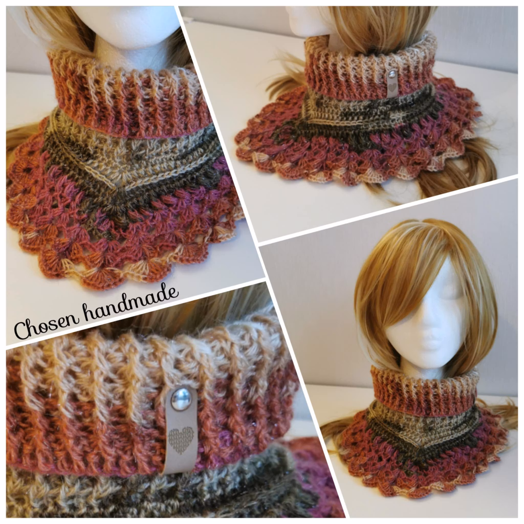Halskrage med flera vackra mönsterdetaljer, kragen går ned i en spets fram och bak, virkad i lätt och luftigt garn, lätt som en fjäder!